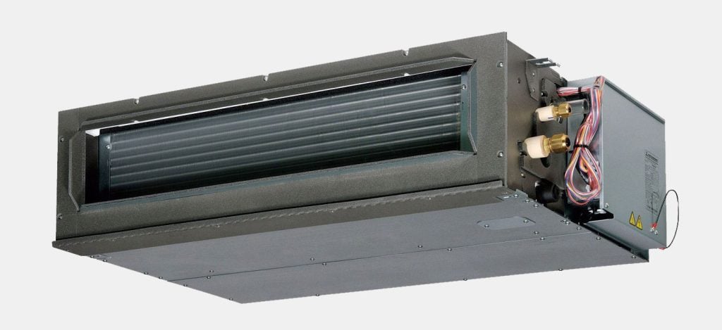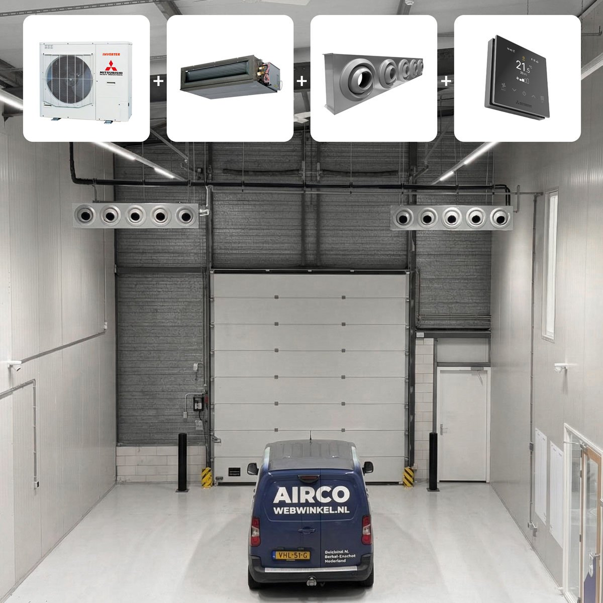 Mitsubishi 10 kW kanaalunit met industriele uitblaas unit voor bedrijfshallen
